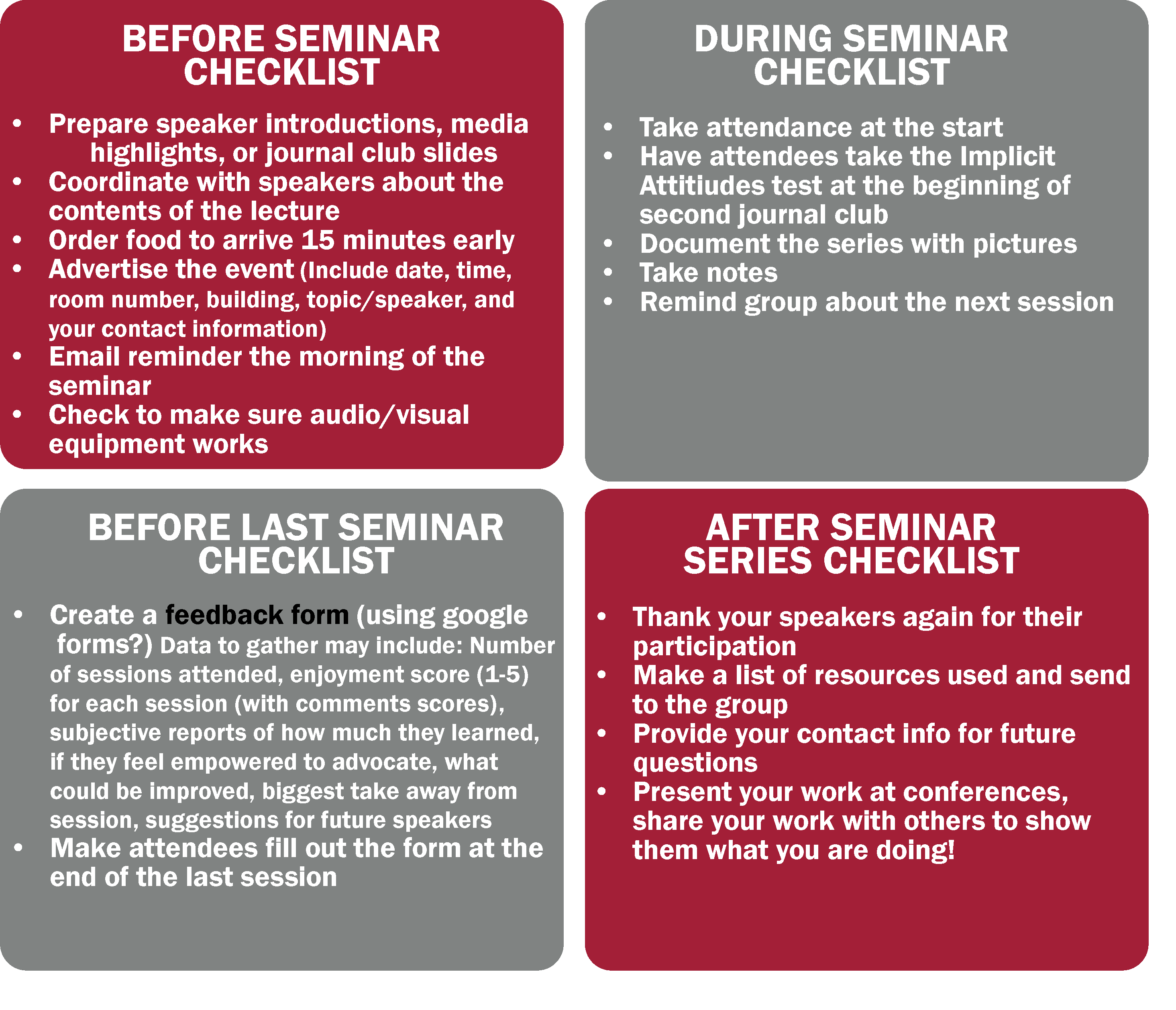 Below is a checklist of key things to remember at specific points during the seminar series.